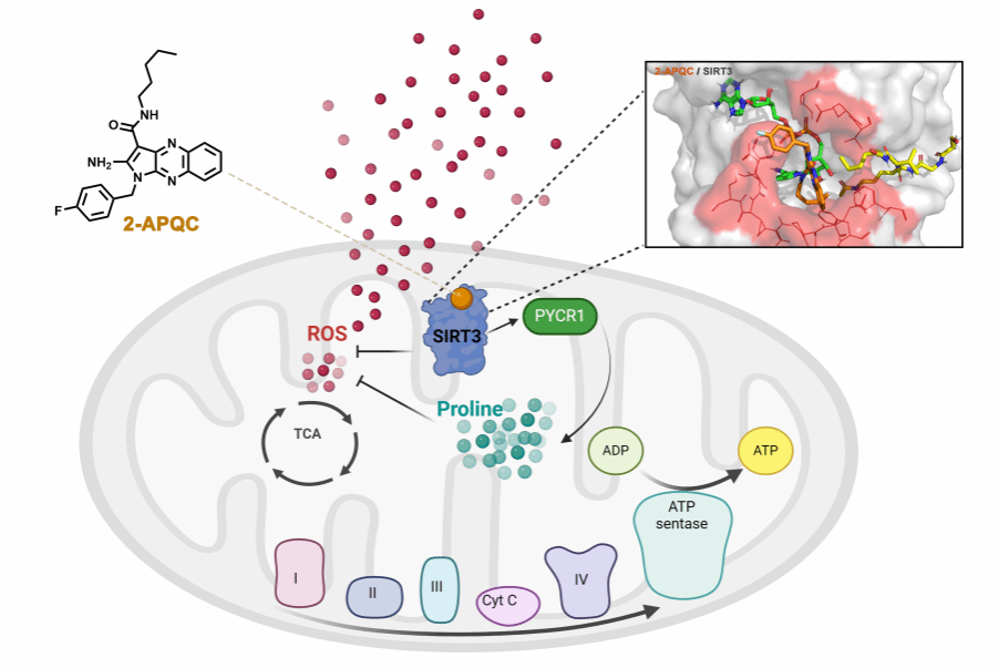 中药以及天然活性成分,是现代药物发现的重要来源,在各种疾病的治疗中均表现出优秀的潜力。心力衰竭是一种复杂的临床综合征,它随着心肌纤维化、心脏肥大或其他心血管疾病的发展而形成,并以心脏结构和功能的异常为特征。随着人口老龄化的加重和普遍的不健康饮食,心衰已成为我国高发的临床疾病。因此,发现新型抗心衰的候选药物是十分迫切,而中医药宝库也为新型药物的发现提供了源源不断的灵感。该研究首次发现了喜树碱衍生结构类似物2-APQC可作为新型靶向SIRT3小分子激动剂通过调控线粒体脯氨酸代谢和ROS代谢稳态来改善心衰(图1)。
