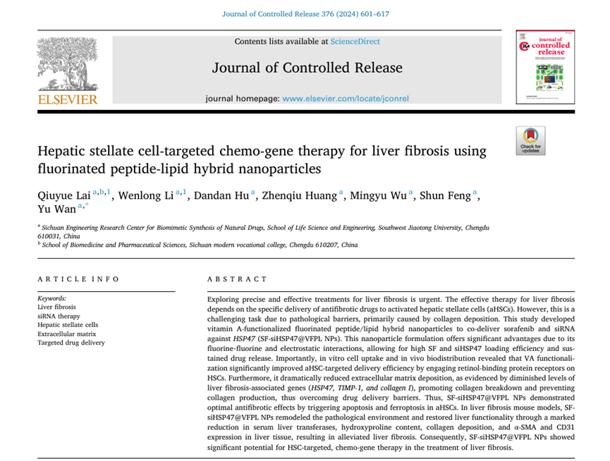“生命分析技术与材料”实验室的研究成果“Hepatic stellate cell-targeted chemo-gene therapy for liver fibrosis using fluorinated peptide-lipid hybrid nanoparticles”。2021级硕士研究生赖秋月为第一作者,万瑜老师为通讯作者。