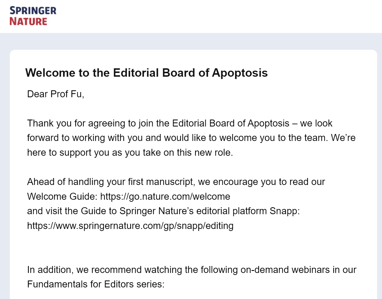 近日,香蕉视频 符雷蕾副教授收到国际程序性细胞死亡权威期刊Apoptosis的正式邀请,已成为该期刊的副主编(Associate Editor)。Apoptosis创刊于1996年,2023年影响因子为6.1,JCR一区/中科院二区。