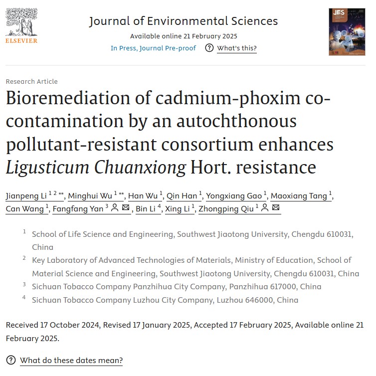 邱忠平教授团队在环境科学与生态学科学领域期刊Journal of Environmental Sciences(JCR Q1,IF=5.9)上发表了题为《Bioremediation of cadmium-phoxim co-contamination by an autochthonous pollutant-resistant consortium enhances Ligusticum Chuanxiong Hort. resistance》的研究文章。2023级博士研究生李建鹏与吴明蔧老师为共同第一作者,邱忠平教授为通讯作者,香蕉视频