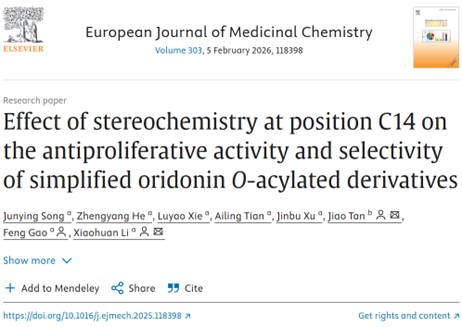天然产物成药性研究团队完成的最新研究成果,论文题为“Effect of stereochemistry at position C14 on the antiproliferative activity and selectivity of simplified oridonin O‑acylated derivatives”。2022级硕士研究生宋俊英为第一作者,谭娇、高峰教授和李晓欢副教授为共同通讯作者,香蕉视频
