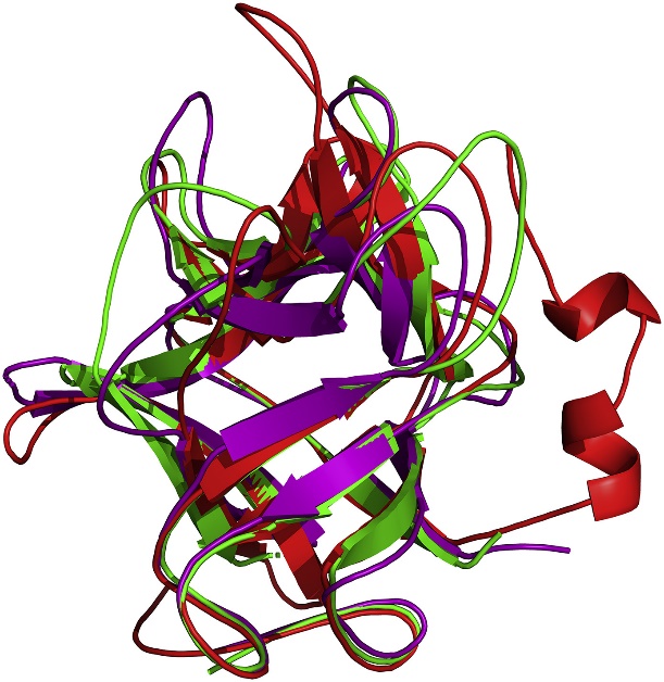 Fig. 1. Structural superposition of all structures of inhibitor COTI (red), STI (green) and TKI (purple).