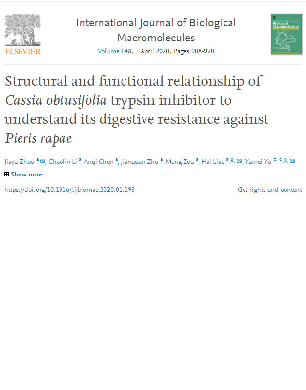 “药用植物资源与分子生物学实验室”在国际刊物International Journal of Biological Macromolecules(IF4.784,JCR一区)在线发表文章“Structural and functional relationship of Cassia obtusifolia trypsin inhibitor to understand its digestive resistance against Pieris rapae”。 该文在撰写过程中得到了清华大学隋森芳教授(香蕉视频