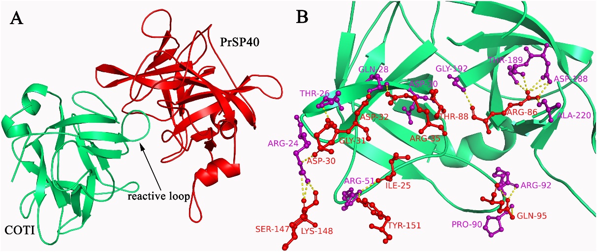 Fig. 2. The complex of COTI with PrSP40. (A) Ribbon diagram representing the docking structure of COTI with PrSP40. (B) The interactions of COTI with PrSP40 in the interface region. Amino acid residues in COTI and bovine trypsin were labeled as red and blue colors, respectively. The hydrogen bonds between COTI and bovine trypsin were shown as yellow dashed lines.