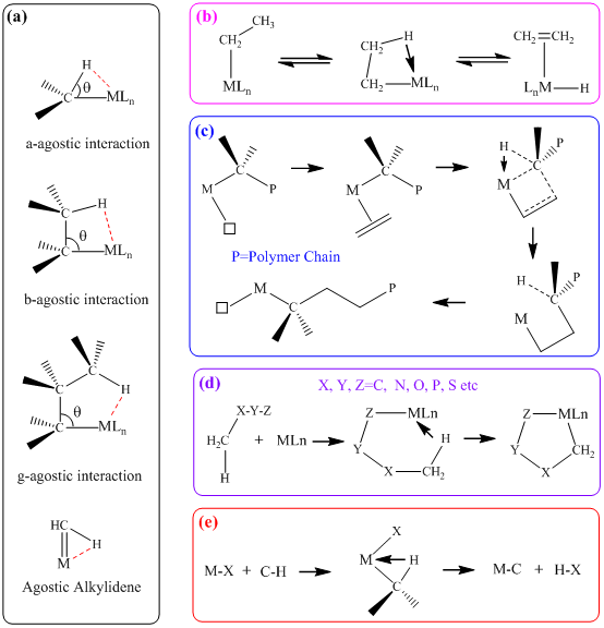 Figure. (a) Types of agostic interactions and their involvements in (b) β-Hydrogen elimination,(c) Ziegler–Natta polymerization, (d) C-H bond activation and (e) cyclometallation.