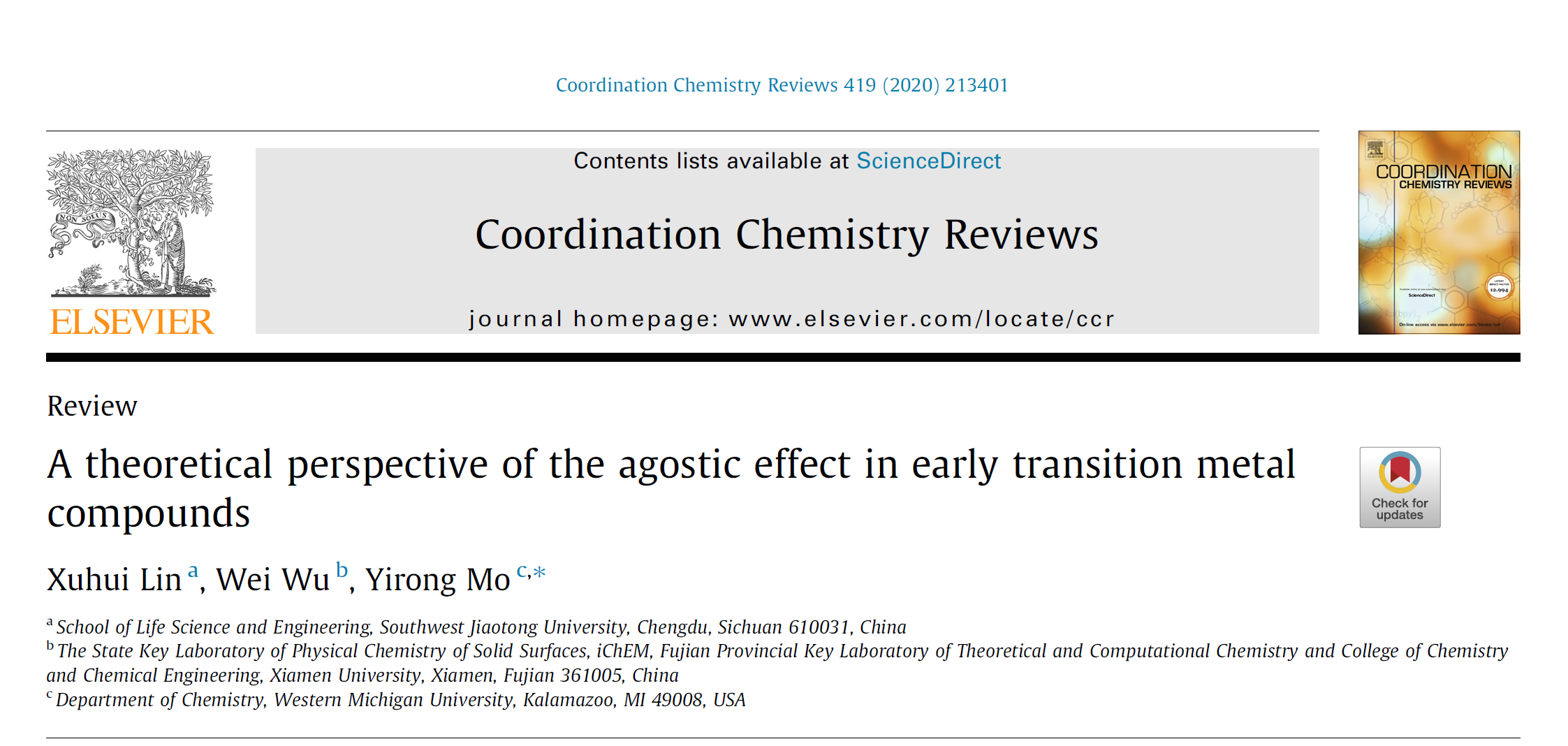 为第一单位在配位化学领域相关期刊《Coordination Chemistry Reviews》 (IF=15.367, 中科院一区TOP期刊) 上发表了题为“A theoretical perspective of the agostic effect in early transition metal compounds”的综述论文,论文回顾了过渡金属抓氢键(Agostic Bond)的发展与研究历程,特别是理论计算方法对其成键本质的研究。