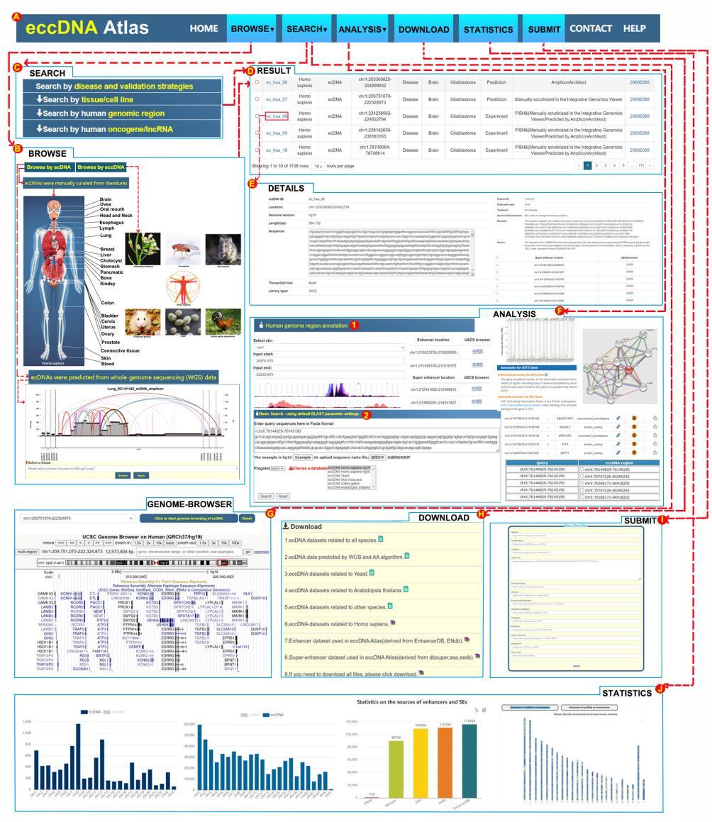 染色体外环状DNA(extrachromosomal circular DNA, eccDNA)是一大类非线粒体和非质粒环状染色体外DNA,其中较长的eccDNA往往被特指为ecDNA。ecDNA可包含全长癌基因与调控区域,在肿瘤发生、癌基因扩增、免疫应答等多个方面发挥着不可或缺的作用。而一般eccDNA由于较短且可循环进入血液,因此为癌症的监测、早期诊断和预测提供了新的视角。随着eccDNA尤其是ecDNA研究的深入,该领域迫切需要一个全面的eccDNA/ecDNA整合、预测、注释与分析平台来助力相关人员的研究工作。