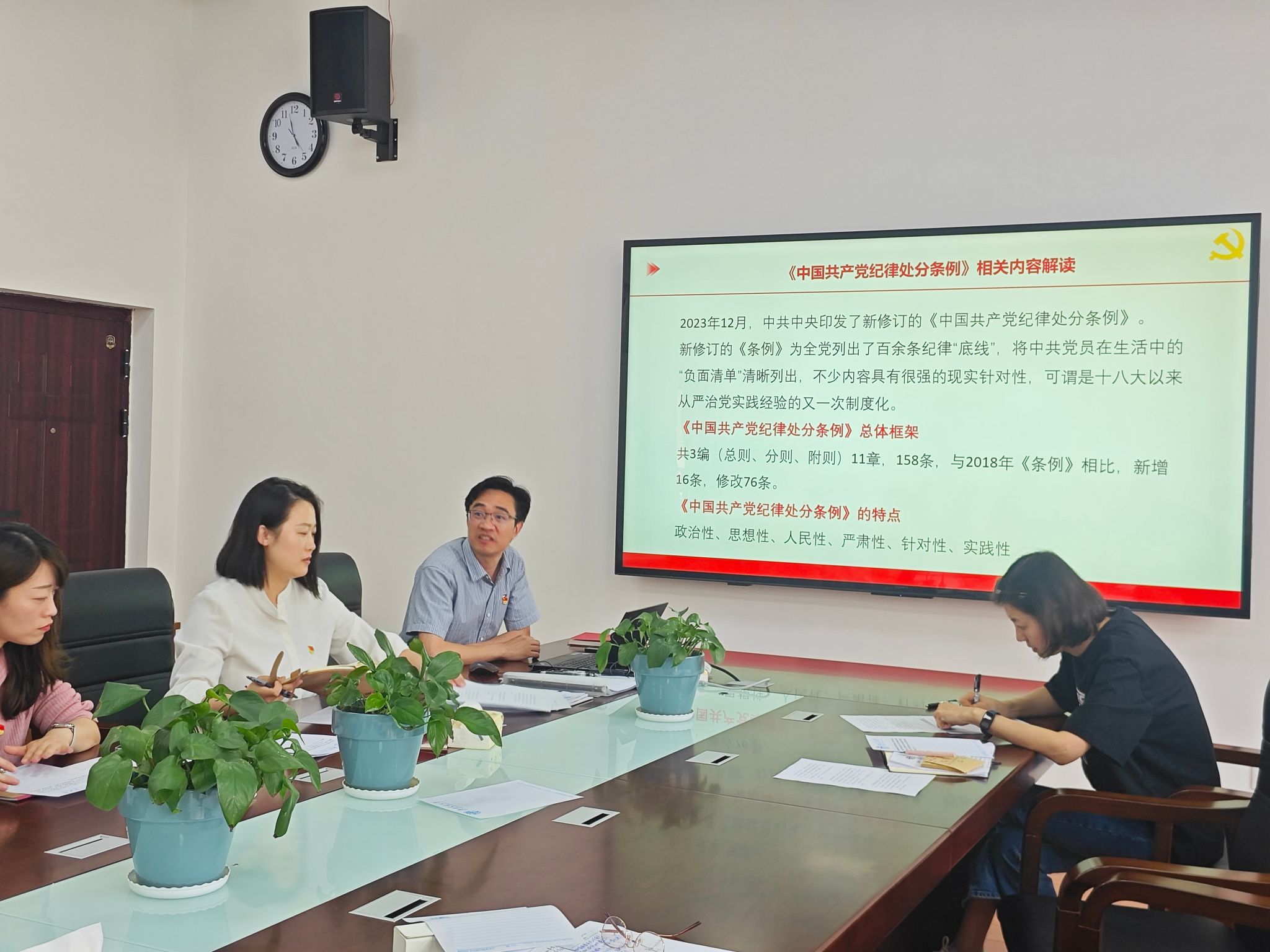 接着,学院党委副书记、纪委书记朱炜为支部党员上党纪学习教育主题党课。朱炜同志带领大家原原本本、逐章逐条学习了《中国共产党纪律处分条例》,并结合违法违纪案例开展警示教育,强调了纪律对于党的健康和纯洁性的重要性,并提醒党员们要时刻保持警醒,严守党的纪律。