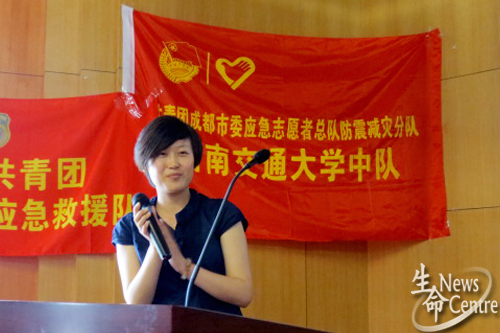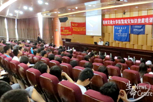 首先,由生命学院团委副书记孔琳老师致辞,在大家观看了一段以4·20雅安地震为主题的视频之后,全体肃立,对地震中的遇难同胞行默哀礼。9:50,培训正式开始,第一项由成都市应急志愿者总队防震减灾分队队长樊晓凡老师结合成都地形、自己在唐山-汶川-芦山三次地震前线抢救的体会及在其他高校进行逃生演习时发生的问题,向大家详细讲解紧急逃生时的注意事项,他重点提到个人要有危机意识,要提前准备好急救包,以备不时之需。