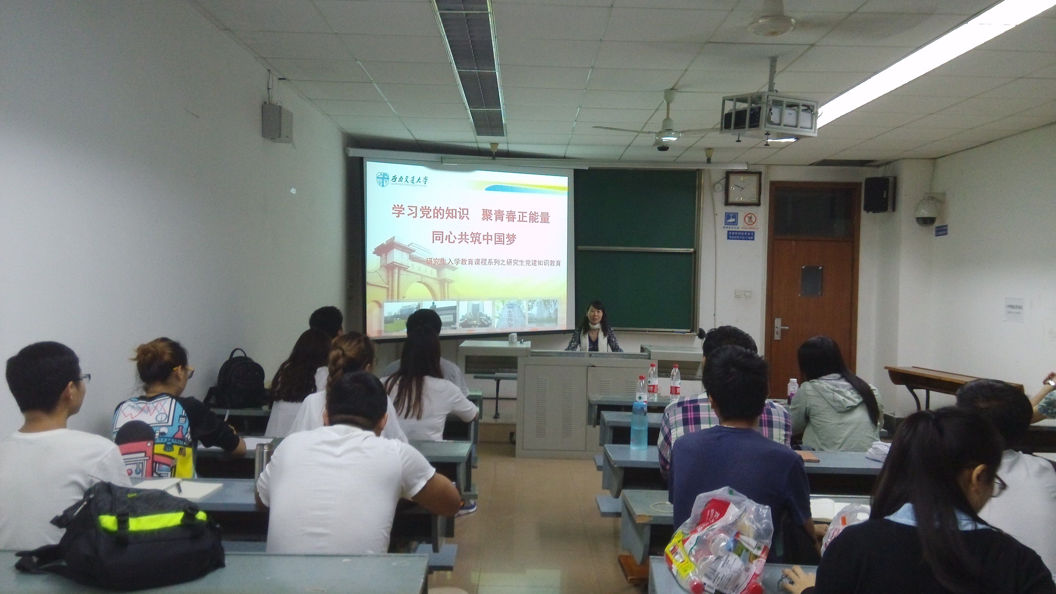 贺妍老师主讲的题目是“学习党的知识,聚青春正能量,同心共筑中国梦”。她为大家介绍了学校学院正在开展的“两学一做”学习教育情况,重点讲解了研究生党员怎样学习党章党规和系列讲话、怎样成为一名合格党员并发挥作用、如何将实现中国梦和实现党员的自我价值相结合等问题。同时她对学校和学院党建工作模式、研究生党建工作体系和党建平台建设等做了简单的介绍,还详细讲解了研究生入党的一些基本要求和主要程序,特别强调了研究生一定要树立正确的入党动机,要明白自己为什么入党和是否自愿入党,要有远大的人生目标和真诚的入党愿望。最后,贺妍老师呼吁大家积极向党组织靠拢,在坚持党员标准中不断完善自己、增长才干、报效祖国。