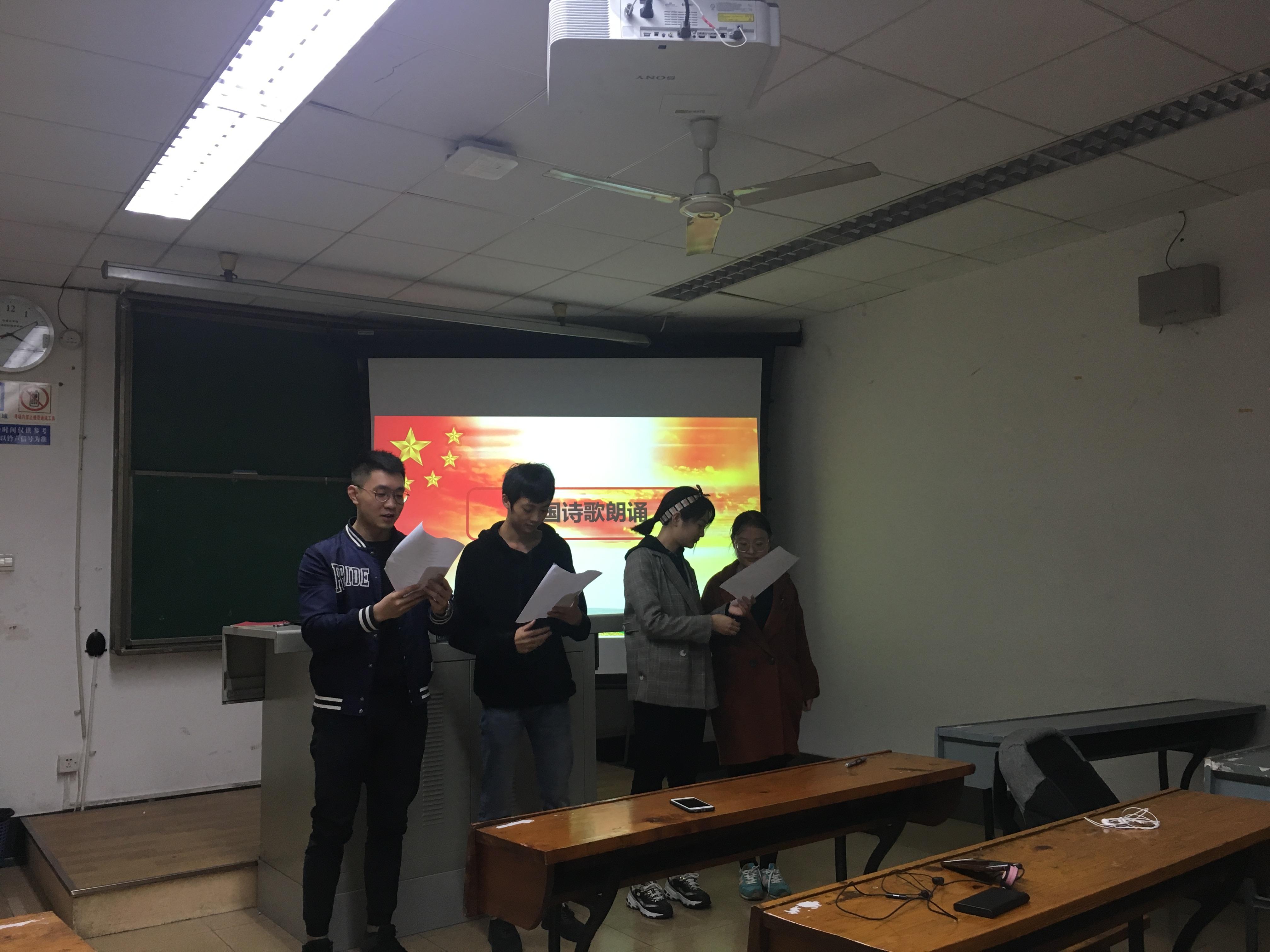 秉持着这份激励、这份榜样力量,同志们在接下来的爱国诗歌朗诵环节尽情释放。大家满怀着爱国激情、深情诵读着一首首充满力量的诗句:“苟利国家生死以,岂因祸福避趋之”“ 愿得此身长报国,何须生入玉门关” “王师北定中原日,家祭无忘告乃翁!”……在雄壮慷慨的诗歌朗诵中,大家深深感悟到:当戍边战士手握钢枪毅然决然的站在祖国的边境线上时、当女排精神一次次起跳在国际赛场时、当航天工作者用智慧和汗水点燃一艘艘神州时,“有国才有家”这句话就会显得异常响亮,身为一名中国共产党党员的青年学子更应该以复兴祖国为己任,顽强拼搏,奉献终身!