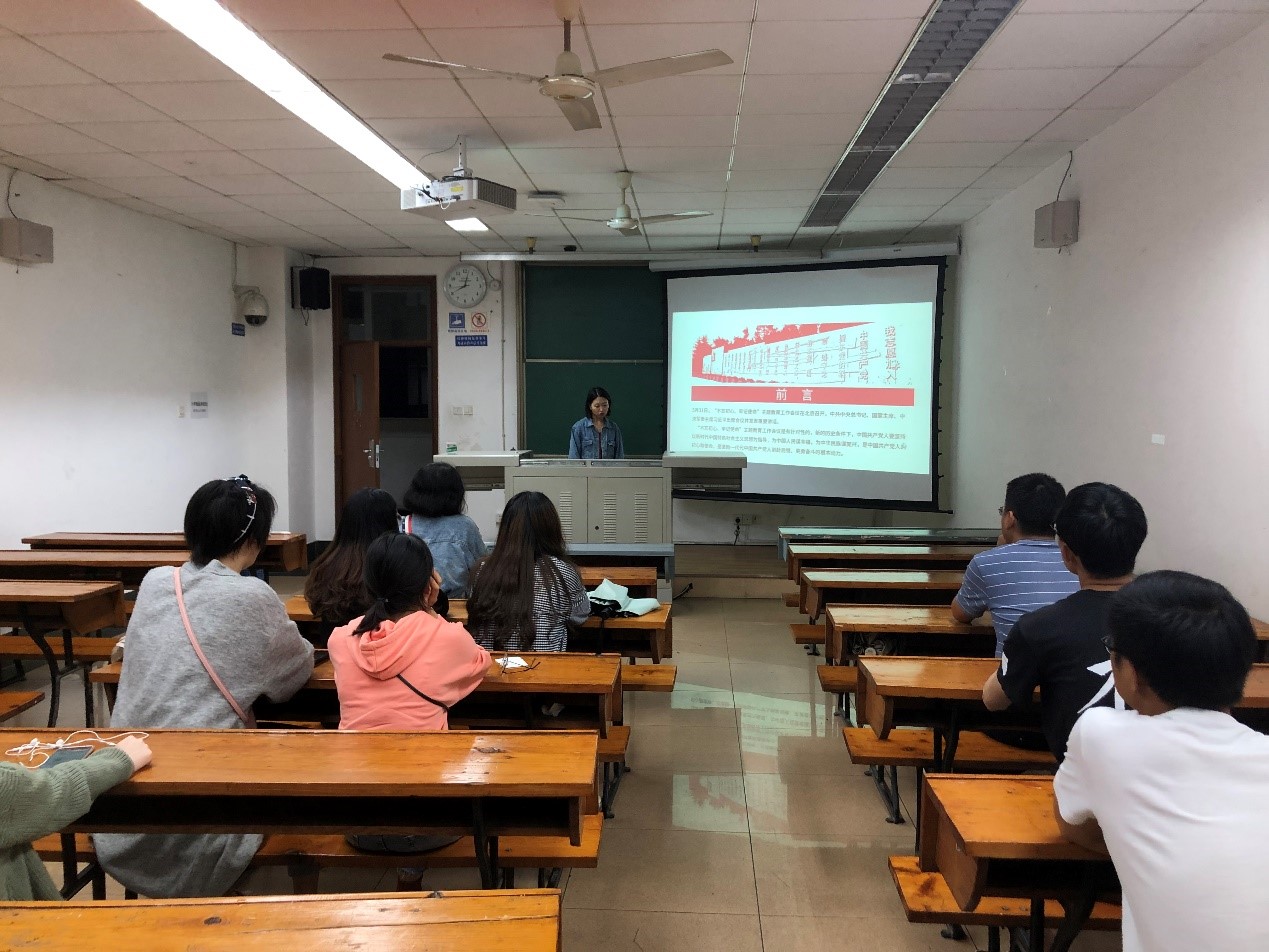 生命学院2018级硕士研究生党支部于94日晚在逸夫馆4304B教室联合开展了以“认真学习习近平总书记在“不忘初心、牢记使命”主题教育工作会议、中央政治局第十五次集体学习上发表的重要讲话精神”为主题的党日活动。活动由2018级党支部书记王珏同志主持,支部的党员和积极分子都参加了活动。