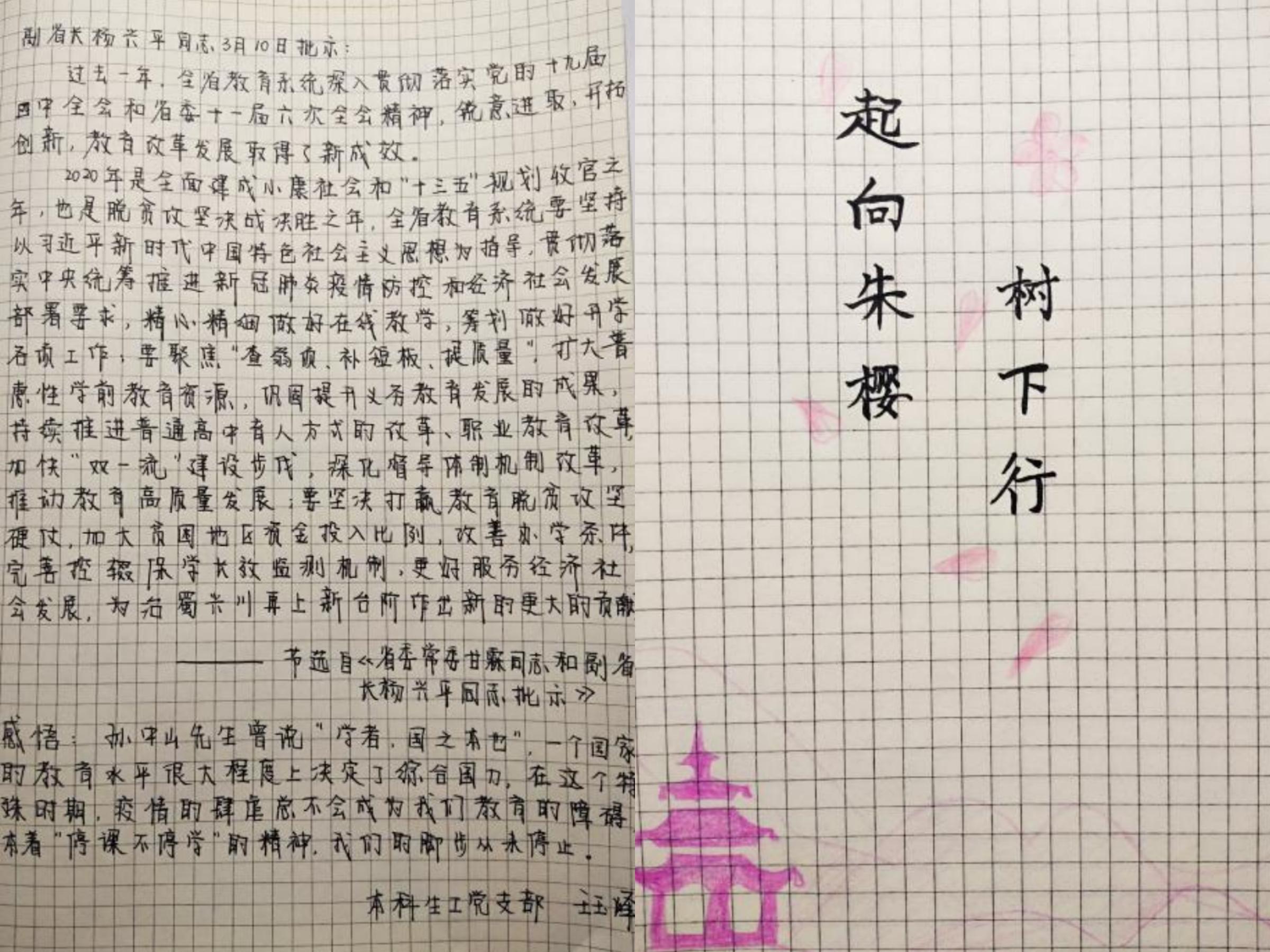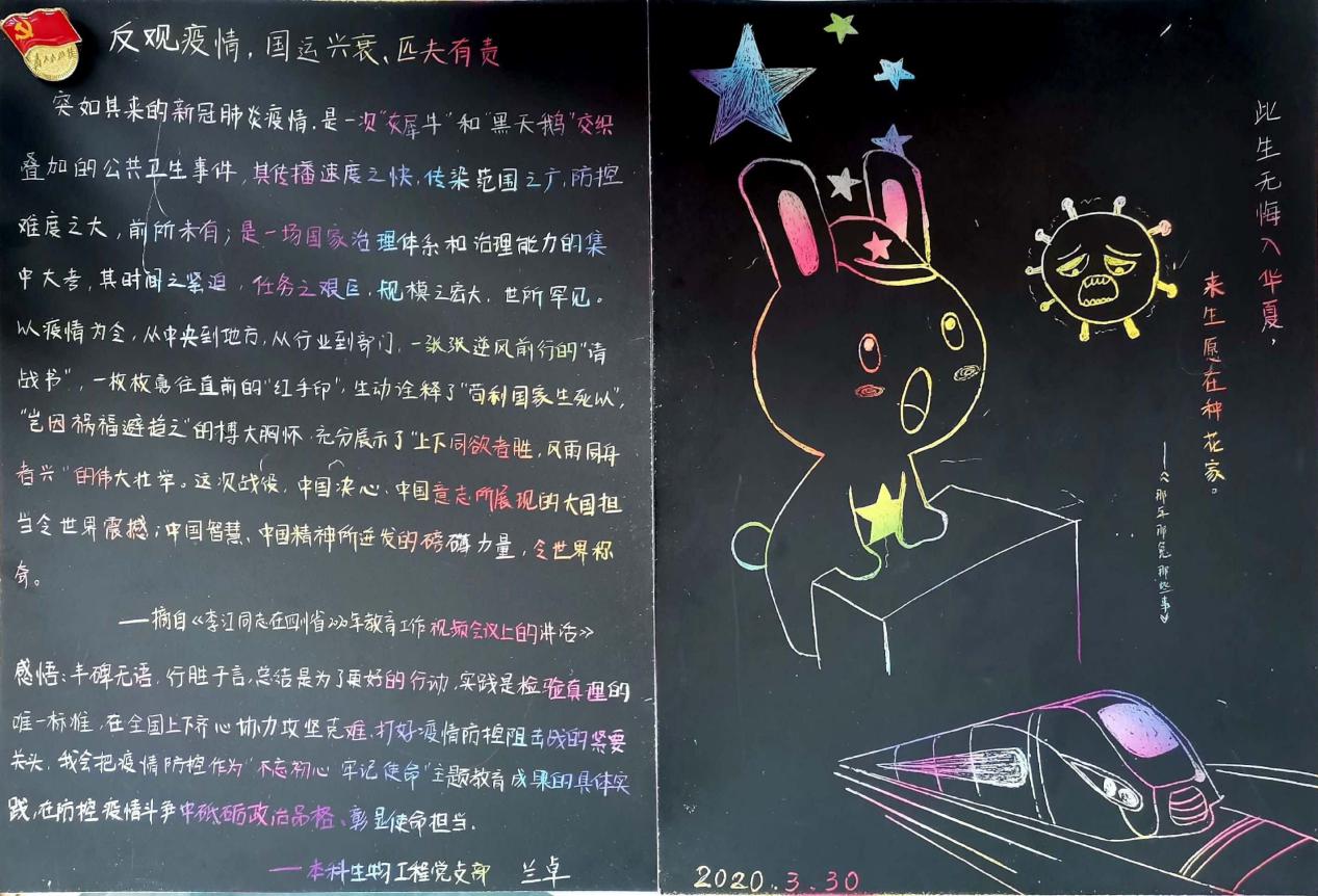 线上会议结束后,支部各位党员同志、积极分子以摘抄、写感悟、配图文的形式认真学习会议精神,贯彻学校党委“抓好疫情防控不放松,抓好各项重要工作不懈怠”的要求。