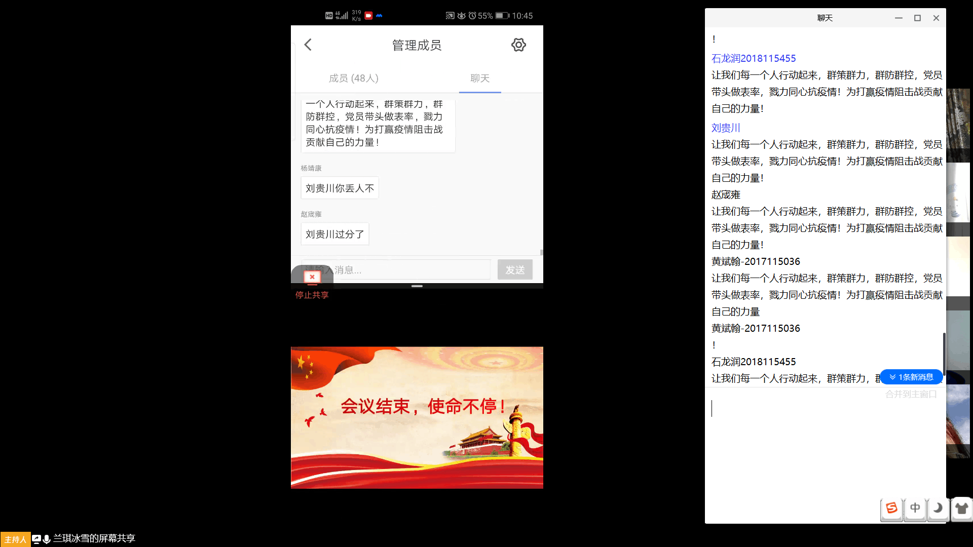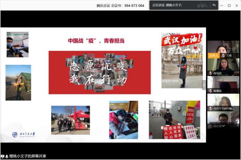 随后,在下一环节中,同学们纷纷发言,分享自己和身边人在抗“疫”期间的事迹。郝博新同志分享了身边朋友在疫情期间挺身而出,参与抗战一线工作的感动;王溢滟同志分享了自己在家乡担当志愿者的所作所为,希望为家乡的抗疫工作贡献自己的一份力量;尚可欣同志作为身处美国亚特兰大的留学生,分享道:中国大使馆积极组织协调,与亚特兰大四所学校的中国学生会取得联系,为在美留学生发放防疫物资,尚可欣同志深切感谢到我国对于留学生的关心,并为作为一个中国人而感到自豪。不管身处何处,国家永远是我们的依靠。