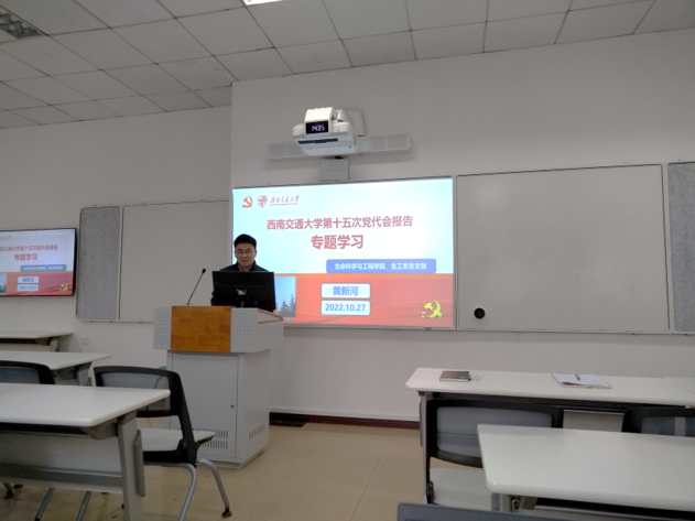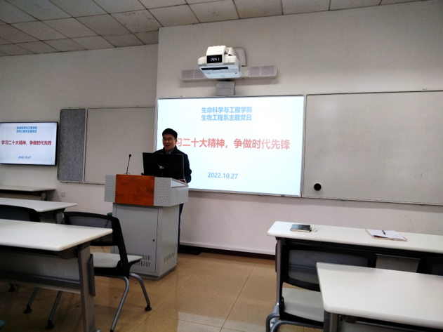 为深入学习贯彻党的二十大精神,让全体党员的思想认识统一到党的二十大精神上来,10月27日下午,生物工程系教工党支部J4118以理论学习和探讨相结合的方式,开展“学习二十大精神·争做新时代先锋”主题党日活动,生物工程系教工党支部书记黄新河领学党的二十大报告原文。
