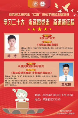 理论学习——微党课之研究生“红路”理论学讲团主题宣讲,特邀请研究生红路学讲团胡持、黄斌翰两位同学作为主讲人为大家带来精彩的主题宣讲。