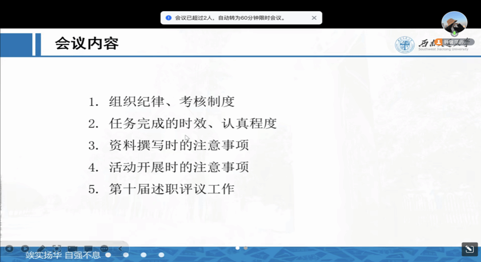 韩馨萍从组织纪律及考核制度、任务时效性及完成度、资料撰写的注意事项、活动开展的注意事项及第十届述职评议活动安排等方面进行交流,明确各部门学生干部的工作任务、工作职责及工作要求,促进了学生骨干的全面发展,为研究生会注入了新的活力和动力。