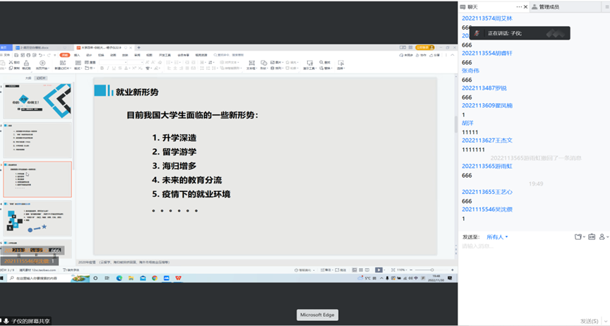 第一部分,杨老师分析了目前我国大学生就业面临的新形势,并通过提问互动的方式,让同学们对自己未来是否有明确的规划提出了思考。