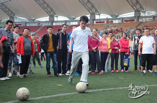 上午11:00,名为“教职工精神抖擞”的教职工跳绳比赛正式开赛,每个学院的五男五女共十位参赛老师都斗志昂扬。生命学院的老师们在比赛前都积极热身,力争拿下一个好名次,一展生命风采。但最终虽然生命学院惜败,但老师们积极参赛,奋力拼搏的精神值得同学们学习。同时,“教职工得意门生”点球大战正如火如荼的进行着,老师们的每次大力射门,燃起了现场观众的足球热情。