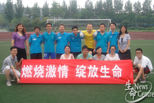经过短暂的休息调整,下半场比赛开始。双方队员都做了一些调整,特别是信息网络中心队加强了防守,采用防守反击的战术。比赛刚开始不久,信息网络中心队抓住了生命学院的一次失误,马上组织反攻扳回了一程。随后又借着这股势气,再进一球。生命学院队马上要求暂停,重新布置战术遏制信息网络中心的边路进攻。生命学院队积极拼抢,一度使双方的激战进入白热化。但是激烈的拼抢也导致了体力迅速的下降,再次被对方抓住机会敲破了球门。这时距本场比赛结束还有五分钟,生命学院队放弃防守,展开绝地反击,几脚极具威胁的射门吹响了反攻的号角,可惜最后没能成功进球。随着本场主裁判哨子吹响,比赛结束。比分最终定格在2:4,信息网络中心队获得胜利,但生命学院队的精彩比赛给大家留下了深刻的记忆。“燃烧激情、绽放生命”,生命学院教职工足球队充满着激情,预祝他们在本届五人制足球比赛中取得好的成绩!