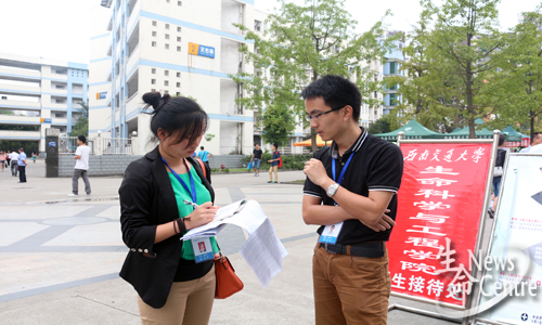 在生命学院新生接待处,迎新工作人员耐心指导新生填写登记信息,为学生家长端水,并与新生和家长进行交流,耐心解答他们对学校、对学院的各种疑问和遇到的问题。学院还为新生专门准备了《交大宝典》,里面详细罗列了新生的报到注册流程、新生须知以及学院情况介绍、常用电话等。新生和家长都纷纷对迎新工作人员表示感谢。13级辅导员高鹏老师不离迎新现场,指导迎新工作。