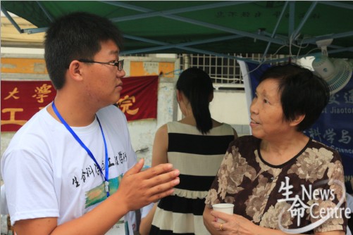通过自主招生进入生命学院的2013级王粮健在迎新第一天即8月27日就来到了学校,看到学长、学姐在迎新现场忙的不亦乐乎,28日,他顺利完成注册、体检事项后,也参与到了迎新工作中。由于对学校建筑分布不甚清楚,目前只能做一些为家长端茶倒水、提送行李之类的“体力活”,但王粮健仍热情依旧,争着向前。
