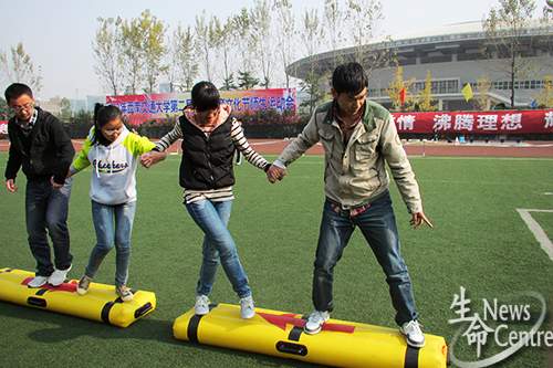 老师唱罢,学生登台,16:00,“摸石过河”比赛正式开始,每个队员都挂着一脸认真的表情,每个动作都小心翼翼,生命小伙伴们通力合作,以两分五十一秒的成绩与留学生组并列亚军。