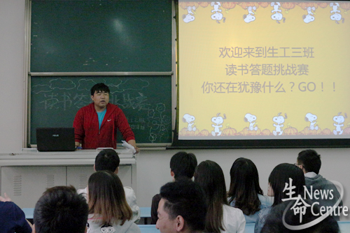 高尔基说:“书是人类进步的阶梯,终生的伴侣,最真挚的朋友。”为培养良好的学习兴趣和阅读习惯,营造勤学习、爱学习、善学习的良好氛围,也为响应校团委“经典悦读”的号召,4月8日下午,12级生工三班全体同学齐聚X2430展开了一场别开生面的书籍知识竞赛活动。