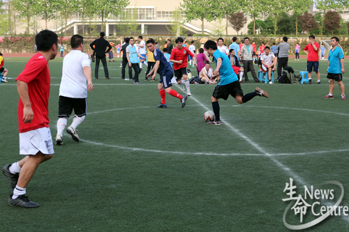 的企图,教务处开始干扰我方的快攻。随着时间的推移,比赛进入白热化阶段。在上半场马上要结束时,教务处踢进一球,上半场结束时,比分为1:1,平局。