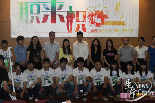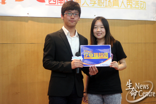 团委、学生会承办的第二届“职来职往”——西南交大职场真人秀决赛在犀浦校区图书馆一号报告厅成功举行。生命学院党委副书记罗妍妍老师、工会主席胡久梅老师及团委书记崔健老师、副书记孔琳老师作为嘉宾莅临现场。到场企业代表有:美团网、万学教育、简乐互动、一汽物流、兼职地带、民生银行、辉瑞制药。