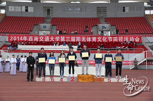 以88.97分的好成绩夺得第一名,艺术与传播学院以87.77分位列第二名,由校体育部主任刘旭为获得学生乙组团体总分前八名单位颁奖。校团委副书记廖军为获得学生甲组团体总分前六名单位颁奖。生命学院许维嘉获得“十佳群体工作先进个人”奖,由校团委副书记廖军为获得“十佳群体工作先进个人”颁奖,校党委副书记桂富强为获得2013-2014年度“十佳群体工作优胜单位”的学院颁奖。生命学院在本届运动会取得了骄人的成绩。