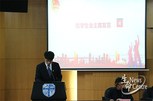 紧接着,校学生会主席赵天胤同学发言。他代表校学生会对生命学院本次大会的召开表示祝贺,同时肯定了生命学院学生会近期工作,他希望学生会所有成员更当坚持努力学习,加强自身的责任感和使命感,为更好地服务全体同学,为把香蕉视频