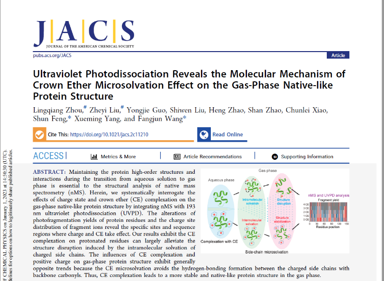 “生命分析技术与材料”封顺教授团队与中国科学院大连化学物理研究所王方军教授和杨学明院士团队合作的最新研究成果“Ultraviolet Photodissociation Reveals the Molecular Mechanism of Crown Ether Microsolvation Effect on the Gas-Phase Native-like Protein Structure” (DOI: 10.1021/jacs.2c11210)。论文共同一作为香蕉视频