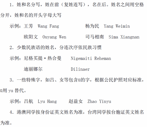 英文姓名、姓名拼音标准格式参看《中国人名汉语拼音字母拼写规则》具体实例如下: