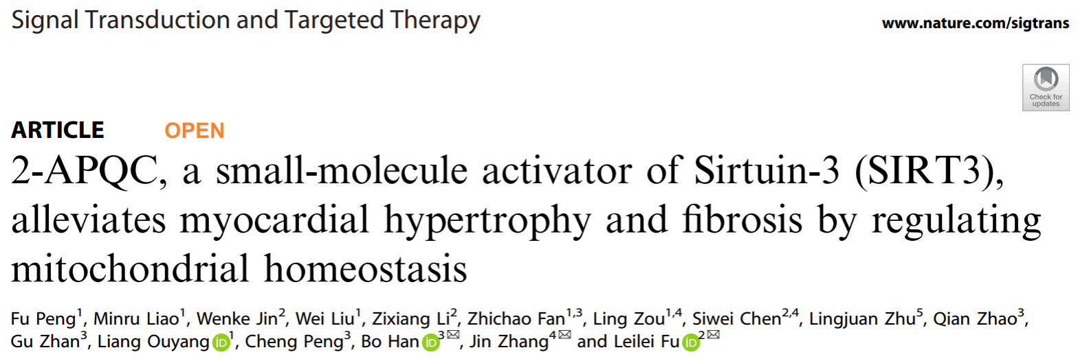 符雷蕾课题组联合四川大学药学院彭芙课题组与深圳大学药学院张瑾课题组及成都中医药大学药学院的合作者们在Signal Transduction and Targeted Therapy (中科院一区Top期刊,影响因子:39.3) 上共同发表了题目为“2-APQC, a small-molecule activator of Sirtuin-3 (SIRT3), alleviates myocardial hypertrophy and fibrosis by regulating mitochondrial homeostasis”的研究性论文,论文的最后通讯作者为香蕉视频