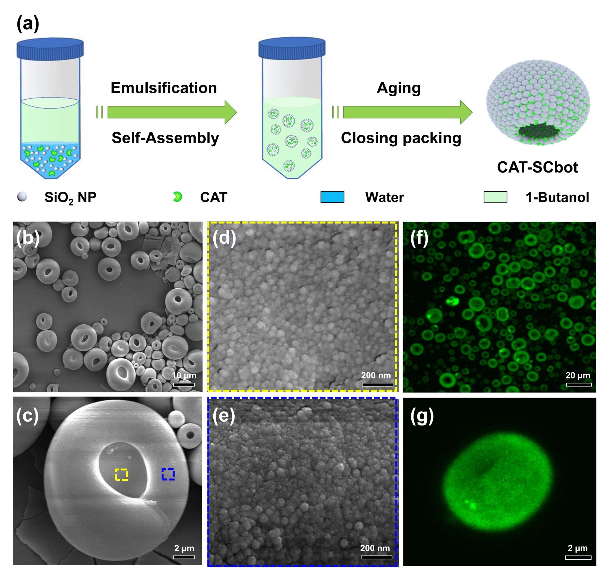 文章亮点:①开发了一种载酶胶体囊的气泡驱动型微机器人(图1),微机器人的酶活保留率高达91%;②本研究提出的制备方法为不对称性微机器人的构建提供了新平台(图2);③以框架颗粒二氧化硅、动力酶过氧化氢酶(CAT)和反应酶碳酸酐酶(CA)为积木组合,组建出了用于“on-the-fly”仿生封存温室气体二氧化碳的微机器人(CAT/CA-SCbots)。