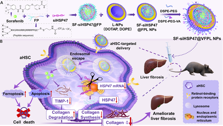 该研究开发了维生素A功能化的氟化多肽/脂质混合纳米颗粒(SF-siHSP47@VFPL NPs),以共同递送索拉非尼和siHSP47(靶向热休克蛋白47的siRNA)到aHSCs,进而实现对肝纤维化的治疗(主要研究路线如下图所示)。研究发现该氟化多肽因其氟-氟和静电相互作用,对索拉非尼和siHSP47有高装载效率。另外,功能化的VA通过结合aHSCs上的视黄醇受体,显著提高了aHSCs靶向性。有效的HSP47基因沉默阻止胶原蛋白的生成,索拉非尼通过抑制TIMP-1基因促进胶原分解,进而减少了细胞外基质沉积,从而克服了药物传递障碍,使SF-siHSP47@VFPL NPs顺利触发aHSCs的凋亡和铁死亡而表现出优异的抗肝纤维化作用。研究表明SF-siHSP47@VFPL NPs具有抗纤维化治疗的潜力。