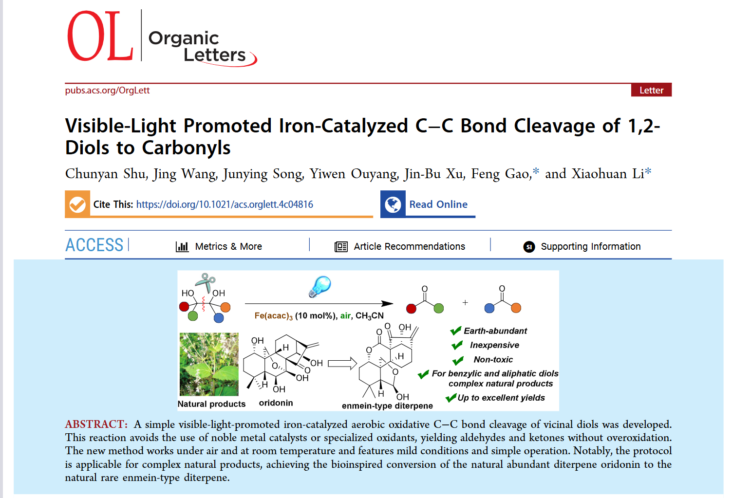 “活性天然产物成药性研究”实验室的最新研究成果“Visible-Light Promoted Iron-Catalyzed C–C Bond Cleavage of 1,2-Diols to Carbonyls”。2022级硕士研究生舒春艳为第一作者,高峰教授和李晓欢副教授为通讯作者,香蕉视频