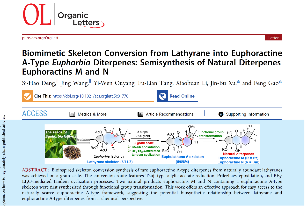 高峰教授团队的最新研究成果“Biomimetic Skeleton Conversion from Lathyrane into Euphoractine A‑Type Euphorbia Diterpenes: Semisynthesis of Natural Diterpenes Euphoractins M and N”。硕士研究生邓思浩和王婧为第一作者,硕士研究生欧阳艺文和唐博莲,以及李晓欢副教授参与该项工作,高峰教授和徐巾卜助理教授为通讯作者,香蕉视频