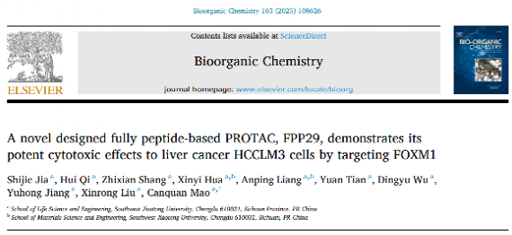 “分子靶向药物药理实验室”题为“A novel designed fully peptide-based PROTAC, FPP29, demonstrates its potent cytotoxic effects to liver cancer HCCLM3 cells by targeting FOXM1” 的研究成果。2022级硕士研究生贾世杰为工作主要完成者。论文通讯作者为茆灿泉教授,香蕉视频