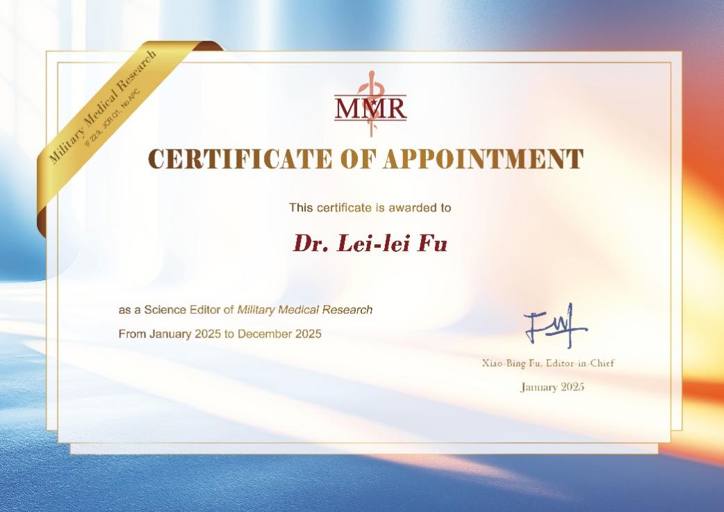 符雷蕾副教授受Military Medical Research总编辑付小兵院士邀请,被任命为Military Medical Research(MMR)科学编辑。