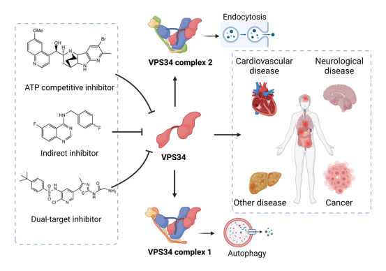 众所周知,VPS34是第三类磷脂酰肌醇3-激酶(PI3K)家族的独特成员,形成VPS34复合物1和复合物2,参与几个关键生理过程。值得注意的是,VPS34复合物1是自噬体生成的一个重要节点,它通过自噬途径控制T细胞的代谢并维持细胞的平衡。此外,VPS34复合体2参与内吞作用以及囊泡运输,并与神经传递、抗原呈现和大脑发育密切相关。由于VPS34的这两个重要的生物学功能,它的失调可以通过改变人类的正常生理结构而导致心血管疾病、癌症、神经系统疾病和许多类型的人类疾病的发生。