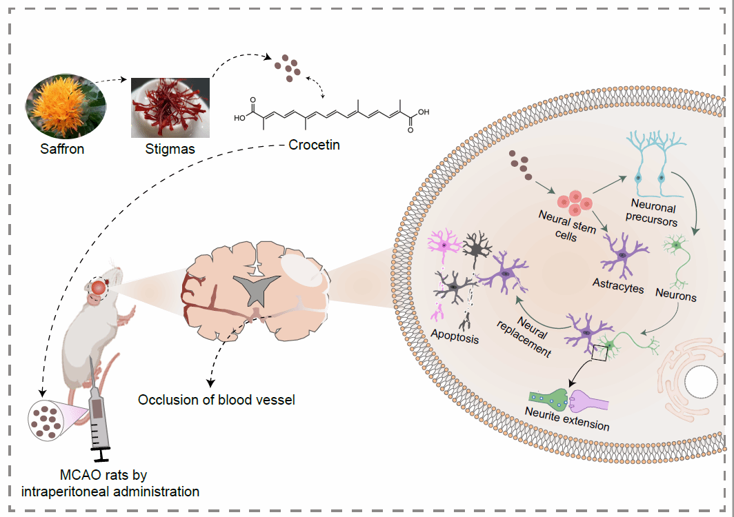 谭睿教授团队长期从事中药(尤其是藏药)的脑卒中治疗研究,在前期药物活性筛选的基础上,该研究主要针对藏药活性成分藏花酸调控内源性神经干细胞分化展开研究。