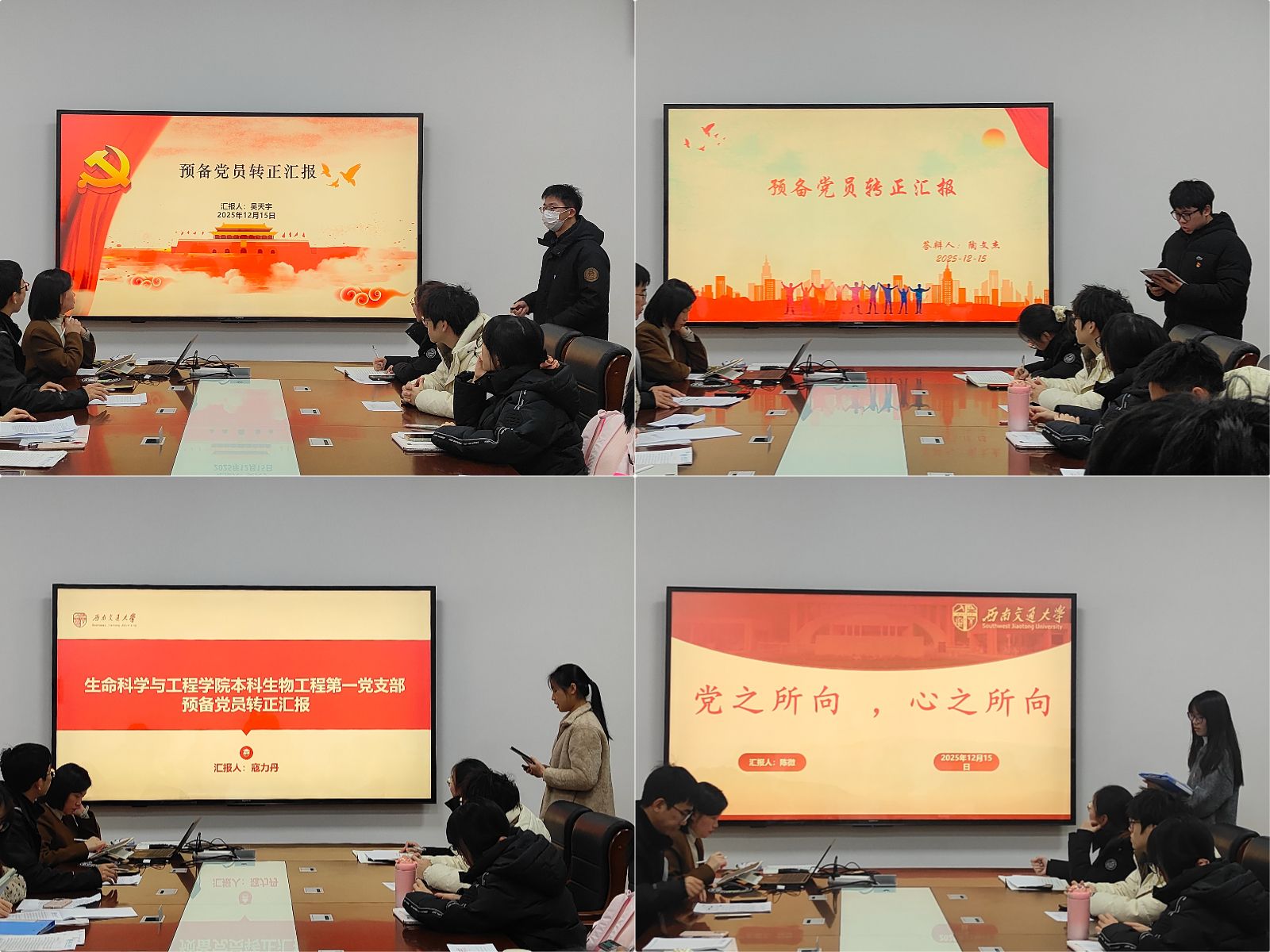 在预备党员转正审议环节,吴天宇、陶文杰、寇力丹、陈微4名同志依次宣读转正申请,详细汇报预备期内的思想、学习与实践表现。随后,入党介绍人介绍其培养考察情况,与会党员进行民主评议。经无记名投票表决,全体党员一致同意4名同志按期转为正式党员。