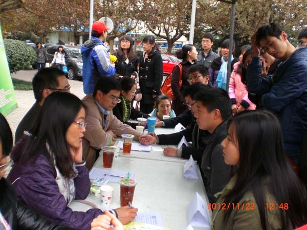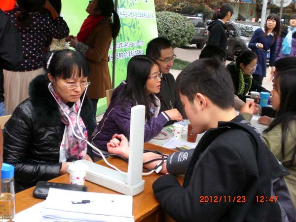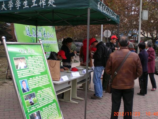 自11月21日起,生命学院2012级研究生两个党支部的所有党员就拉开了该项活动的宣传工作序幕,他们发放传单、进行讲解,向广大师生简要介绍了本次活动的目的和内容。生命学院党委副书记王书会和研究生辅导员贺妍还多次到场进行指导。11月23日11:00,生命学院的五位专家学者准时到场,而此时现场已有一些老年人和同学在等候。五位专家一就座,就开始细心听取咨询者们反映的关于自身健康和营养方面的问题。他们耐心地帮咨询者进行分析和指导,给出了自己的意见和建议,中医药“大夫”们还现场开具了处方,让咨询者们心满意足。过往的很多学生也纷纷赶过来,测量血压、营养咨询、询问病因和预防措施……路过并咨询的人也越来越多,在场专家和党员志愿者们也忙的不亦乐乎,五位老师在现场简单地用完盒饭后马上又投入到了咨询服务中去。尽管天气略显寒意,但丝毫挡不住大家的服务热情,咨询现场一度火热。直至下午五点,仍有不少人前来咨询,老师和志愿者们坚守岗位,竭诚为最后一位咨询者服务完才离开。