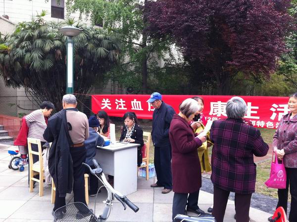 退休教职工等老人对高血压的疑问和困惑,并为他们提供较为科学的预防和治疗措施,4月12日上午9:00到11:00,研究生2012级二班党支部在镜湖宾馆多功能厅门前小广场举办了主题为“关注血压,健康生活”社会服务活动。在活动现场,不少老年人前来咨询一些关于高血压的问题和自身健康方面的问题,同时接受了志愿者们为他们义务听诊和测量血压,还询问了病因和预防措施。经过此地的很多老师和同学也纷纷前来咨询,直到中午时分天气转雨,志愿者们竭诚为最后一位咨询者服务完才离开。
