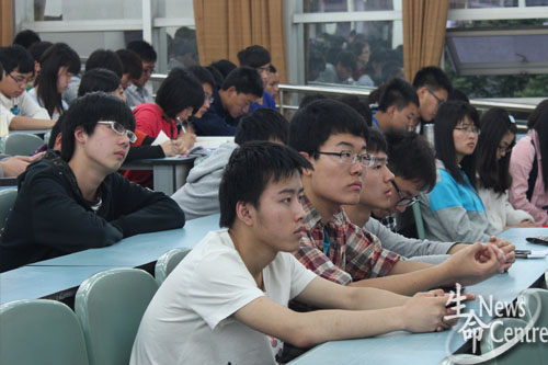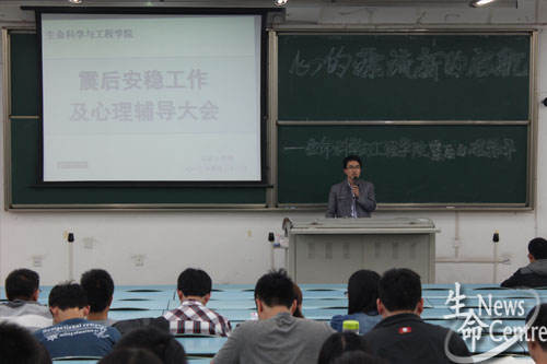 崔老师首先向大家传达了学校关于这次震后安全稳定工作的最新精神,提醒同学不要恐慌,但仍要保持警惕,提防余震,要相信政府,相信学校。第二部分,崔老师向大家详细介绍震时逃生原则和被埋之后的自救方法,并结合“5·12”汶川地震时的具体情况和学校一系列应付措施,特别指出,如发生余震,同学们应及时有序地向临时避难所疏散,并以教学区和宿舍区的示意图加以解释,切忌因惊慌而出现踩踏事故;住高层同学的同学遇震时要及时切断电源,打开门,寻找“三角区”或狭小稳固的空间,一定不要选择跳楼。