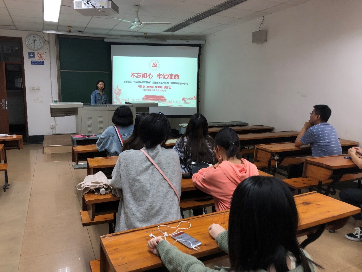 生命学院2018级硕士研究生党支部于94日晚在逸夫馆4304B教室联合开展了以“认真学习习近平总书记在“不忘初心、牢记使命”主题教育工作会议、中央政治局第十五次集体学习上发表的重要讲话精神”为主题的党日活动。活动由2018级党支部书记王珏同志主持,支部的党员和积极分子都参加了活动。