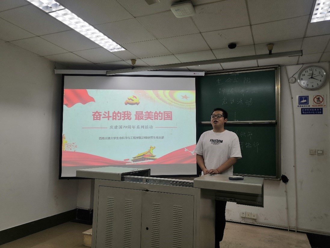 国庆假期的脚步刚刚离开,国庆的氛围却仍未消褪,我们仍然沉浸在礼炮轰鸣,队列整齐的阅兵气势中。今年是祖国的70周年华诞,每个中华儿女都怀揣喜悦和祝福为祖国母亲庆生,在这样浓烈的爱国热情感染之下,生命学院2019级研究生党支部也顺势开展了“奋斗的我,最美的国”的教育活动。活动于10月8日下午16:00在教室J4305a开展,此次活动由党支部书记吴京川同志主持。