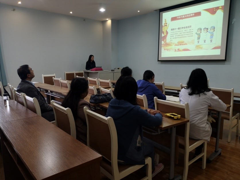2019年10月24日,实验中心党支部书记张纯姑同志为支部成员讲授专题党课,主题为中华人民共和国成立70周年“重大历史事件回顾”。张纯姑同志带领全体党员同志们重温了从各个时期我国的重大历史事件,从建国初期人民英雄纪念碑建成,抗美援朝,60年代中国第一颗原子弹氢弹爆炸成功,70年代中国恢复联合国合法席位,恢复高考,十一届三中全会,到80年代对外开放,90年香港澳门回归,抗洪抢险,进入2000年后奥运的申办,加入WTO,载人航天飞船飞行成功,辽宁号,两会,纪念抗战70周年大阅兵。让大家了解了各个时期中国的重要事件,同志认真学习听取了报告,深刻感受到我们国家的变化发展,经历的考验,对中国取得的伟大成果由衷的自豪。